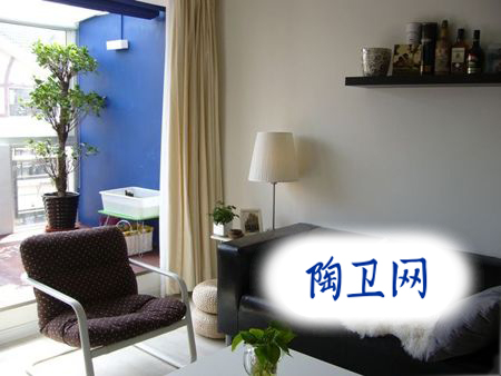 客廳的皮質沙發(fā)。沙發(fā)黑色的,窗簾米白色的,再加上開放式的小陽臺,舒適、簡約。