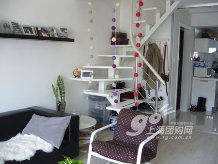 客廳的另一頭--樓梯。 我們的扶手只做了一邊,另外一邊就用球球燈象征性的裝飾了一下。