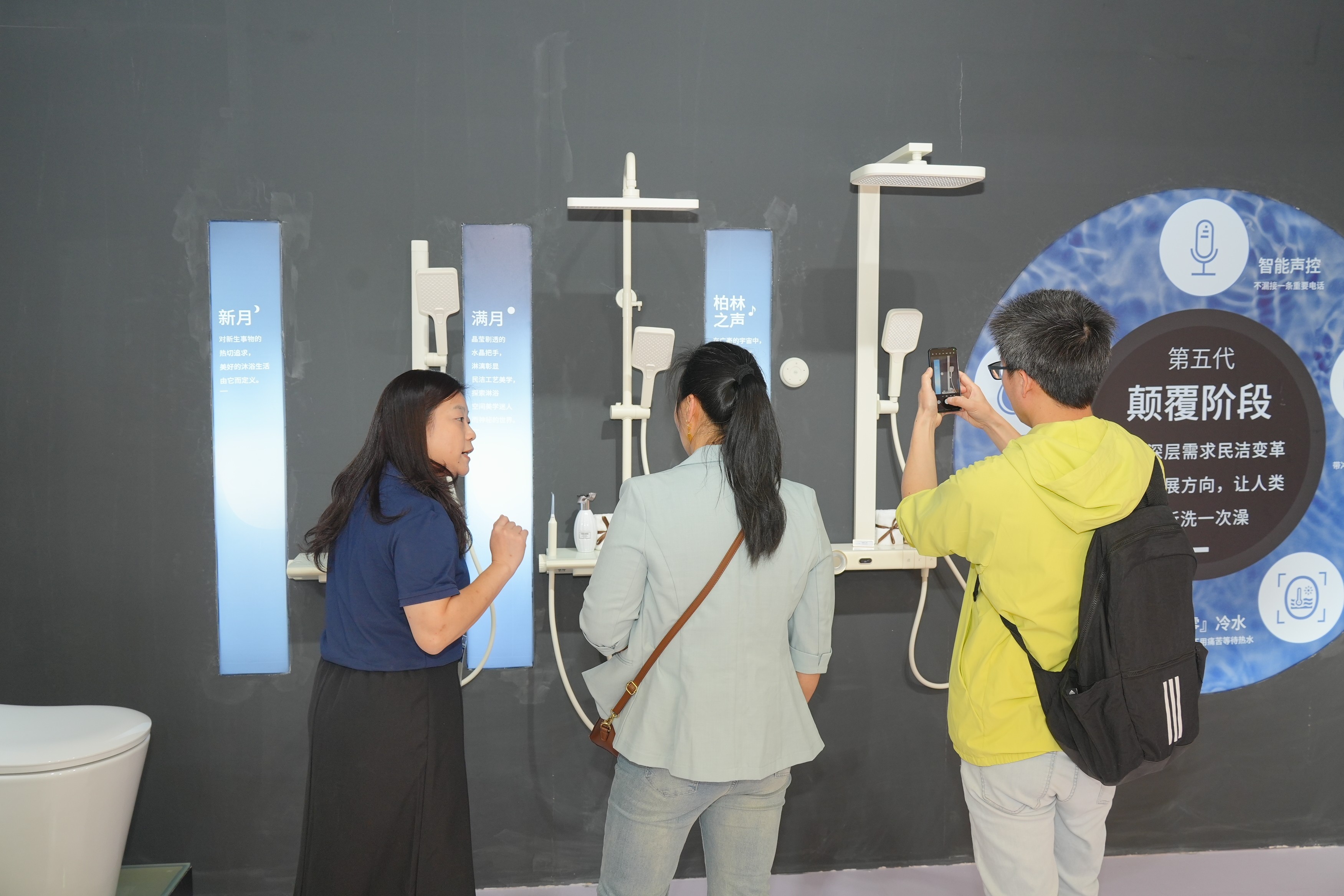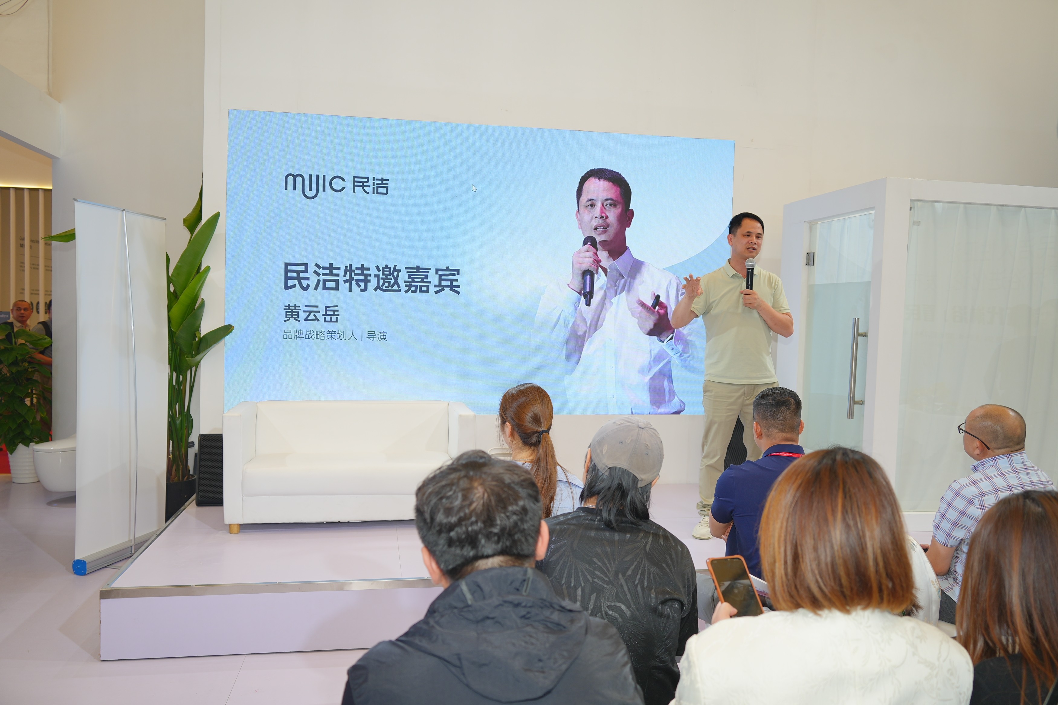 民潔衛(wèi)浴經(jīng)營(yíng)管理部部長(zhǎng)蘇建彬在場(chǎng)的媒體和觀眾介紹了“第五代淋浴”的設(shè)計(jì)理念與五大亮點(diǎn)功能。